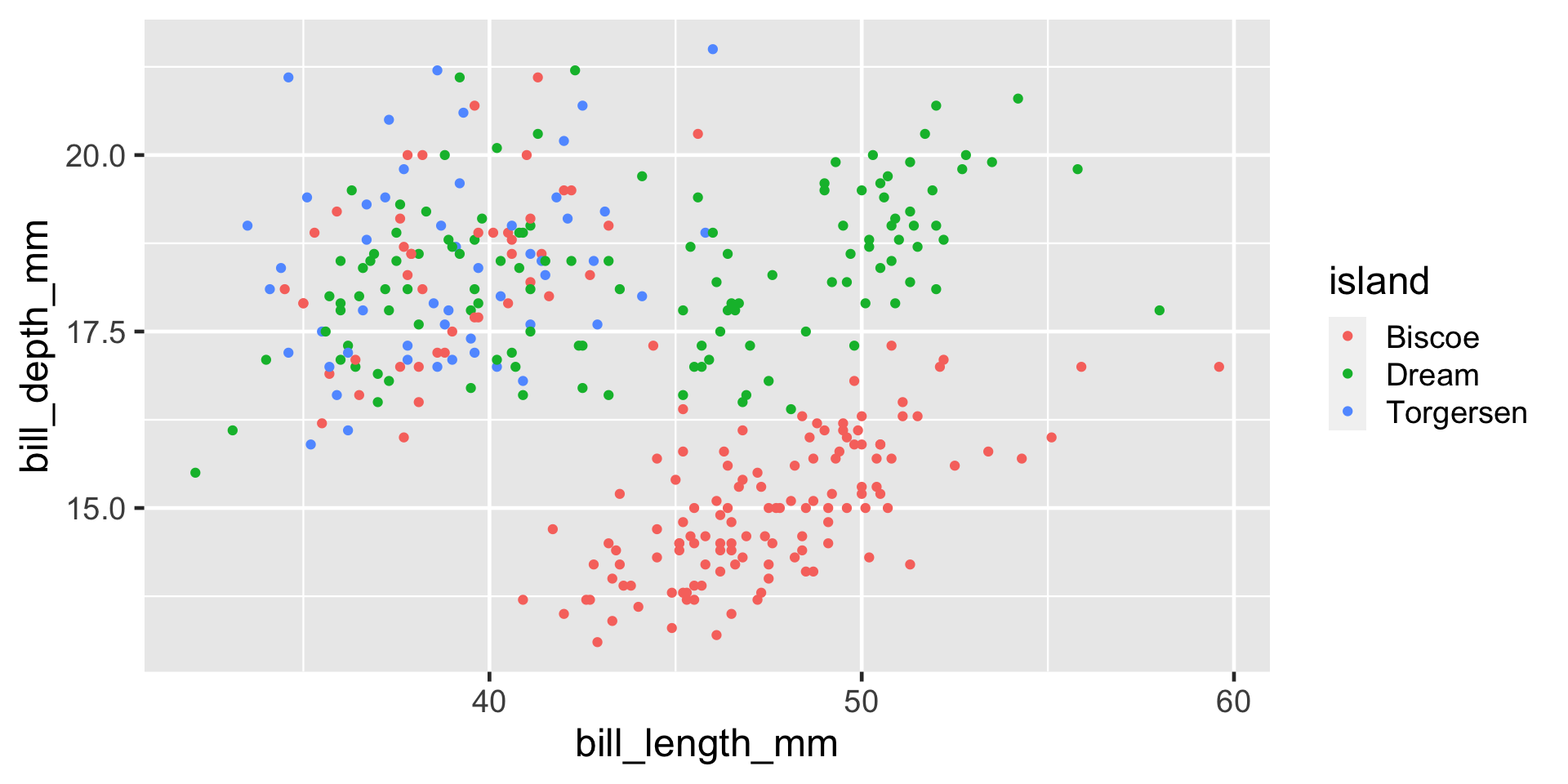 #| fig-alt: Scatterplot showing the bill sizes of penguins across three islands.