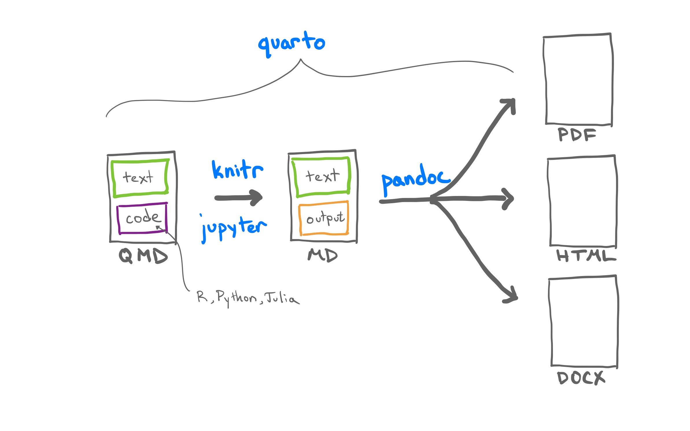 Quarto is a command line interface (CLI) that renders plain text formats (.qmd, .rmd, .md) OR mixed formats (.ipynb/Jupyter notebook) into static PDF/Word/HTML reports, books, websites, presentations and more.